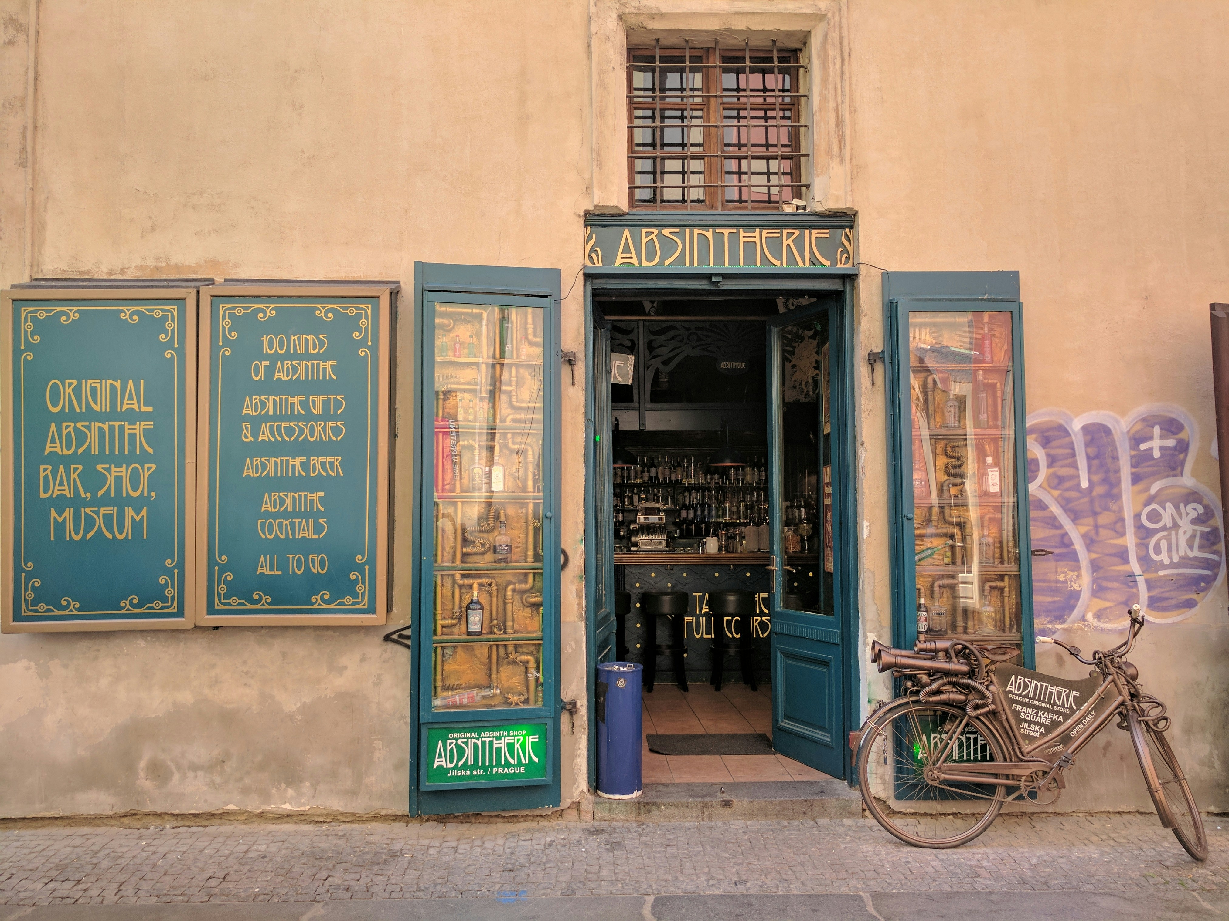 Absintherie shopfront with steampunk bicycle. Photo by Atte Juvonen- Unsplash