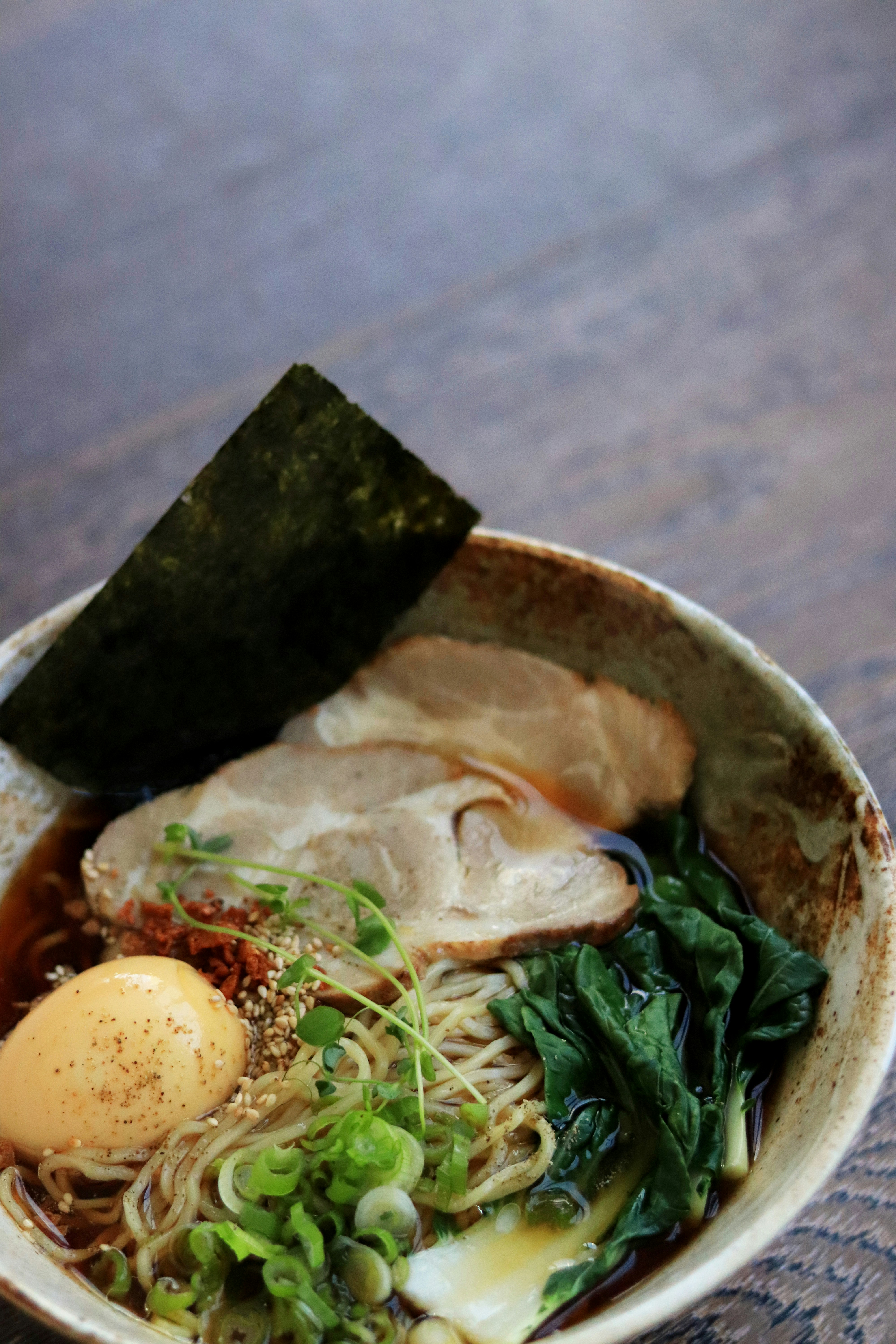 A bowl of soup with some noodles, egg and vegetables. Photo by Cody Chan- Unsplash